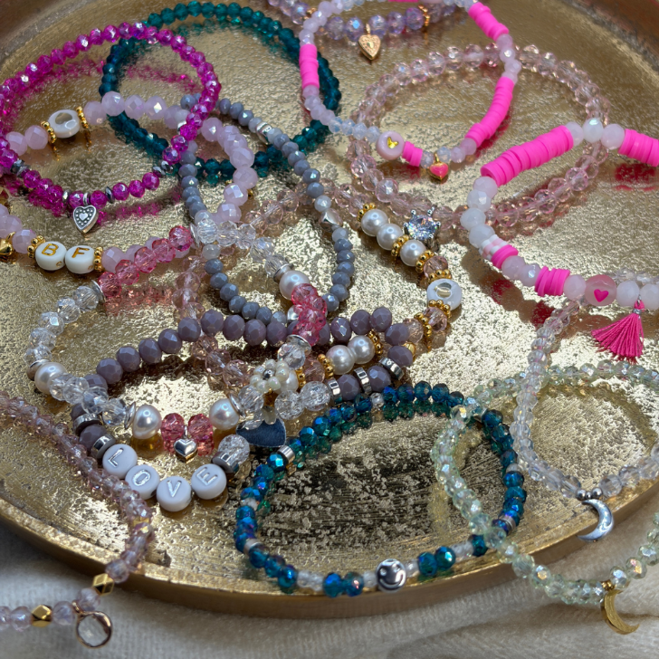 Durch kleine Variationen in Farbe, Form und Details entstehen Stücke, die sich voneinander unterscheiden und ihren eigenen Charakter haben. So bleibt jedes Armband ein kleines Unikat.